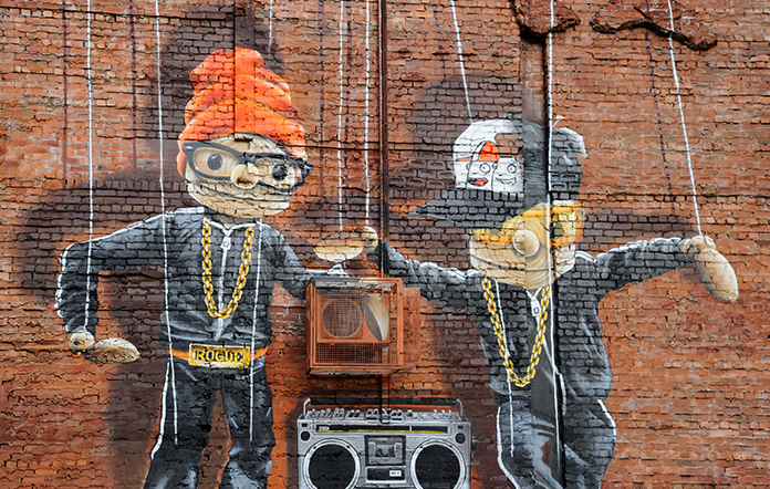 "We thought that an interesting concept would be to have body-poppers or break-dancers in puppet form. I took my influence from a Beastie Boys cover and a Run DMC picture."