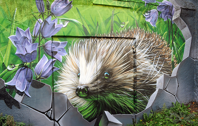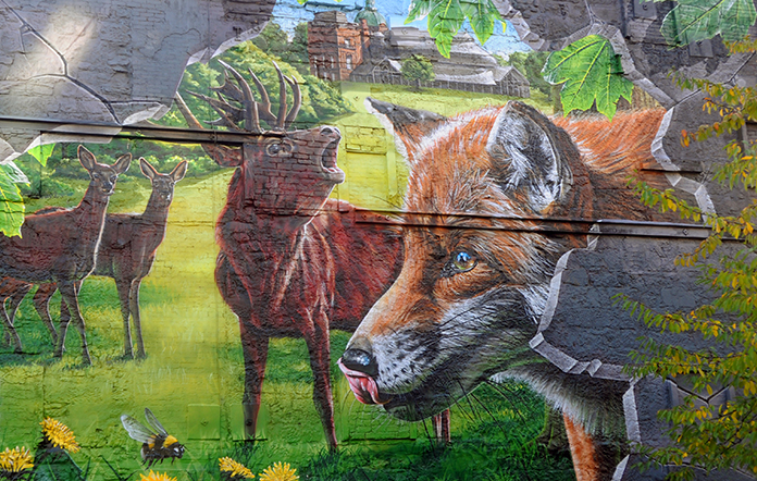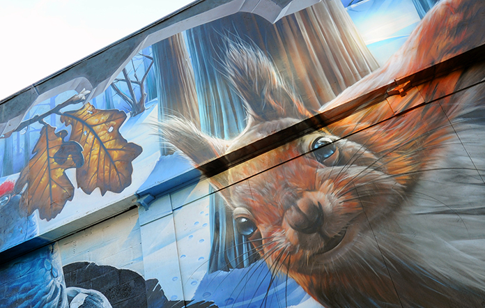 Before the gable end wall overlooking Ingram Street car park featured peeling paint and graffiti. Now thanks to the imagination of Smug it shows all types of animals found in Glasgow’s parks and green space appearing through what looks like holes in the wall.