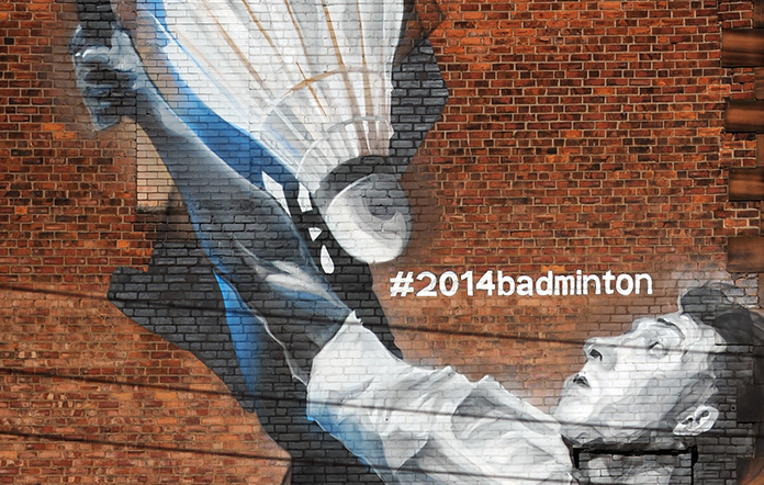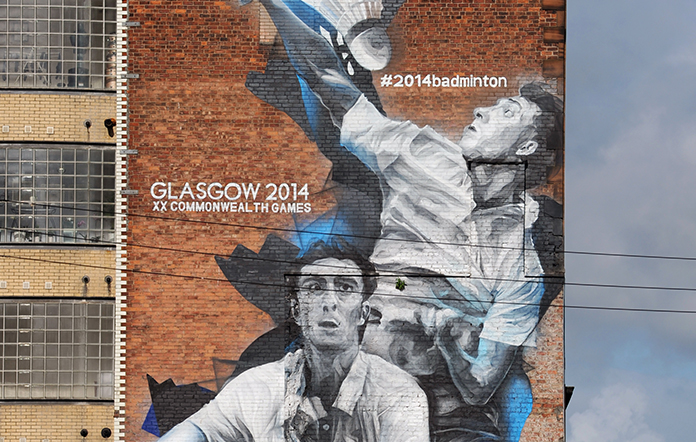 Installed as part of the promotional campaign for 2014 Commonwealth Games, this mural is part of a series depicting various sports. Completed by the same artist, the other murals were installed adjacent to Partick Train Station and represent hockey, netball and rugby. The Badminton mural includes action shots of Scotland player Kieran Merrilees and conveys the speed of the game, as well as the athleticism required to succeed in such a competitive sport.