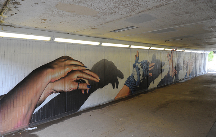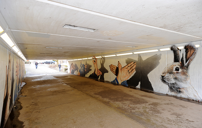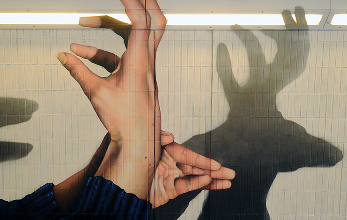 Let’s assume that hand shadow puppetry, known to specialists as shadowgraphy or ombromanie, began with the caveman. Just assume. We were looking for something with a bit of wow factor to brighten up what was becoming an increasingly dingy, although very well used underpass. The concept was born, like a shadow from a flame, and off went Mr Rogue with the idea, a camera and a will to harass those he met into doing exactly that. “Here, hold your hands up like this and make them look like a squirrel… no, straighten the pinky, I need bigger ears.”