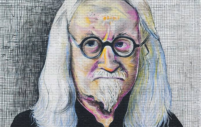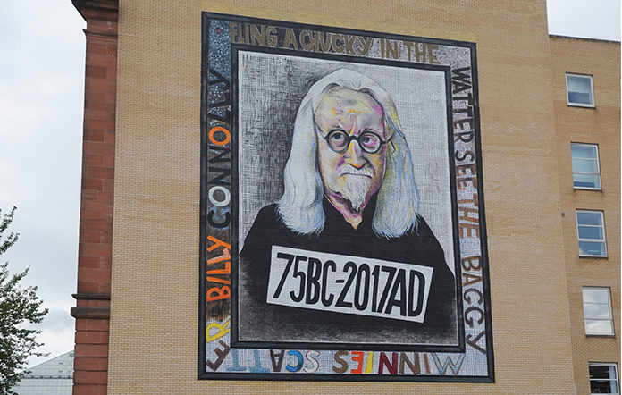 In commemoration of Billy Connolly’s 75th birthday BBC Scotland commissioned three portraits of the comedian by top Scottish artists. In conjunction with Glasgow City Council representations of these original works were then installed around the city centre. Two of these works have been depicted as murals by Rogue One. This particular installation is based on John Byrne’s “Billy Connolly”. All three portraits were showcased, across the country, in a special BBC Scotland programme Billy Connolly: Portrait of a Lifetime and are now on display in the People’s Palace.